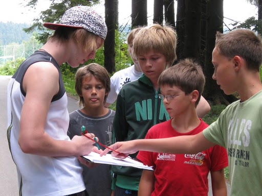 | Die Teams machen sich auf den Weg in den Wald rund um die Adalbert-Stifter-Jugendherberge | ||